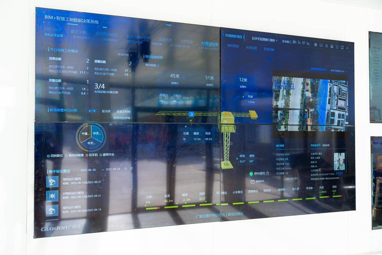 “安全升级是智能建造最突出的价值之一”,胡国平解释称,项目的塔机、升降机监测系统能实时预警,若是塔机吊钩偏移、升降机超载,系统会自动报警。同时,AI蜂鸟系统能24小时抓拍未戴安全帽、高空抛物等违规行为,有效保障现场成百上千施工人员的作业安全。