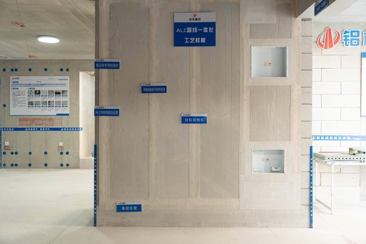 根据工作人员的介绍,地面构造做法一共4层,保证平整的同时,也能保温防裂;砌墙时,项目先用高精砌块,再安装ALC条板拼接完整(ALC条是工厂预制的整体板材),表面平整度高,无明显拼接缝隙;墙面抹灰用的是石膏砂浆,抹灰工艺5步法。